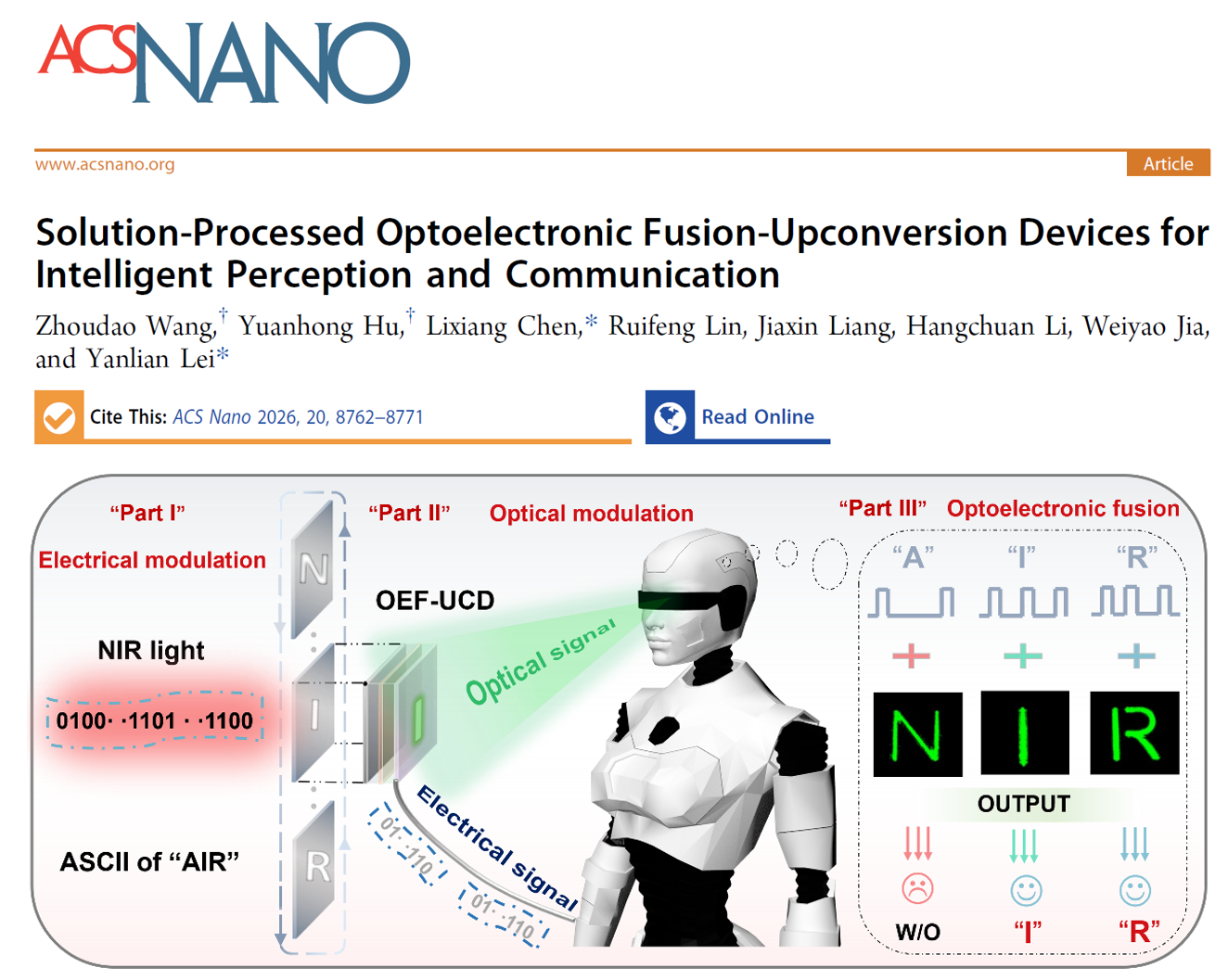 人工智能物联网(AIoT)的快速发展迫切需要能够同时提供直观视觉信息和机器可读信号的多功能传感器。为此,团队人员开发了一种基于溶液法制备的光电融合上转换器件(OEF-UCD),实现了近红外探测与可见光发射的单片集成。该器件采用转印功能层设计,有效解决了传统界面难题,在光电性能方面表现优异:可见光成像分辨率达2303 ppi,对比度8.2×10⁴,开启电压1.8 V;电学读出响应度为0.47 A W⁻¹,线性动态范围121 dB,探测阈值低至9 nW cm⁻²,探测性能与主流有机光电探测器相当。更进一步,团队人员基于该器件的光输出与电输出信号间的内在时序关联,实现了一种“所见非所得”的加密策略——即只有图像与光电流通过预共享密钥进行联合匹配时,才能揭示真实信息。这种“视感融合”的一体化模式将传感、显示与安全通信功能集成于单一低成本光电器件中,为AIoT应用提供了紧凑型信息感知与处理平台。相关结果以“Solution-Processed Optoelectronic Fusion-Upconversion Devices for Intelligent Perception and Communication”为题发表在《ACS Nano》(20, 8762-8771, 2026)上,我院2023级硕士研究生王周道为该论文的第一作者,雷衍连和陈历相副教授为通讯作者,西南大学物理科学与技术学院(微纳结构光电子学重庆市重点实验室)为唯一完成单位。