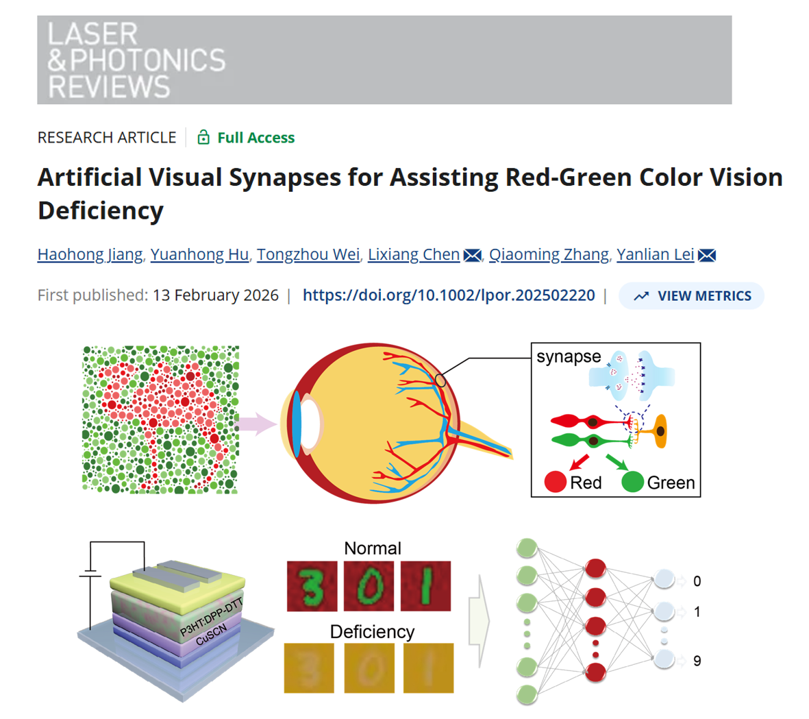 色觉是人类感知外界环境的重要功能,然而红绿色觉障碍(CVD)困扰着数百万人群,严重影响其色觉辨别能力。针对此困境,团队人员设计了一种新型光电突触器件,通过优化基于聚(3-己基噻吩)的有机异质结结构,可将光信号转换为数字突触电流,实现红绿色觉障碍者的色觉增强。与模拟红绿色盲的对照器件相比,该器件的红绿光波长辨别能力实现十倍提升。结合人工神经网络计算,该器件在复杂色觉模式识别中展现出92%的准确率。此外,该器件还可有效增强色弱者的色彩识别能力,实现复杂图案的有效区分。这项工作可为面向视觉修复的下一代生物电子系统和增强色彩感知等领域提供可靠方案和线索。相关结果以“Artificial Visual Synapses for Assisting Red‐Green Color Vision Deficiency”为题发表在《Laser & Photonics Reviews》(e02220, 2026)上,我院2022级硕士研究生江浩弘为该论文的第一作者,雷衍连和陈历相副教授为通讯作者,西南大学物理科学与技术学院(微纳结构光电子学重庆市重点实验室)为唯一完成单位。