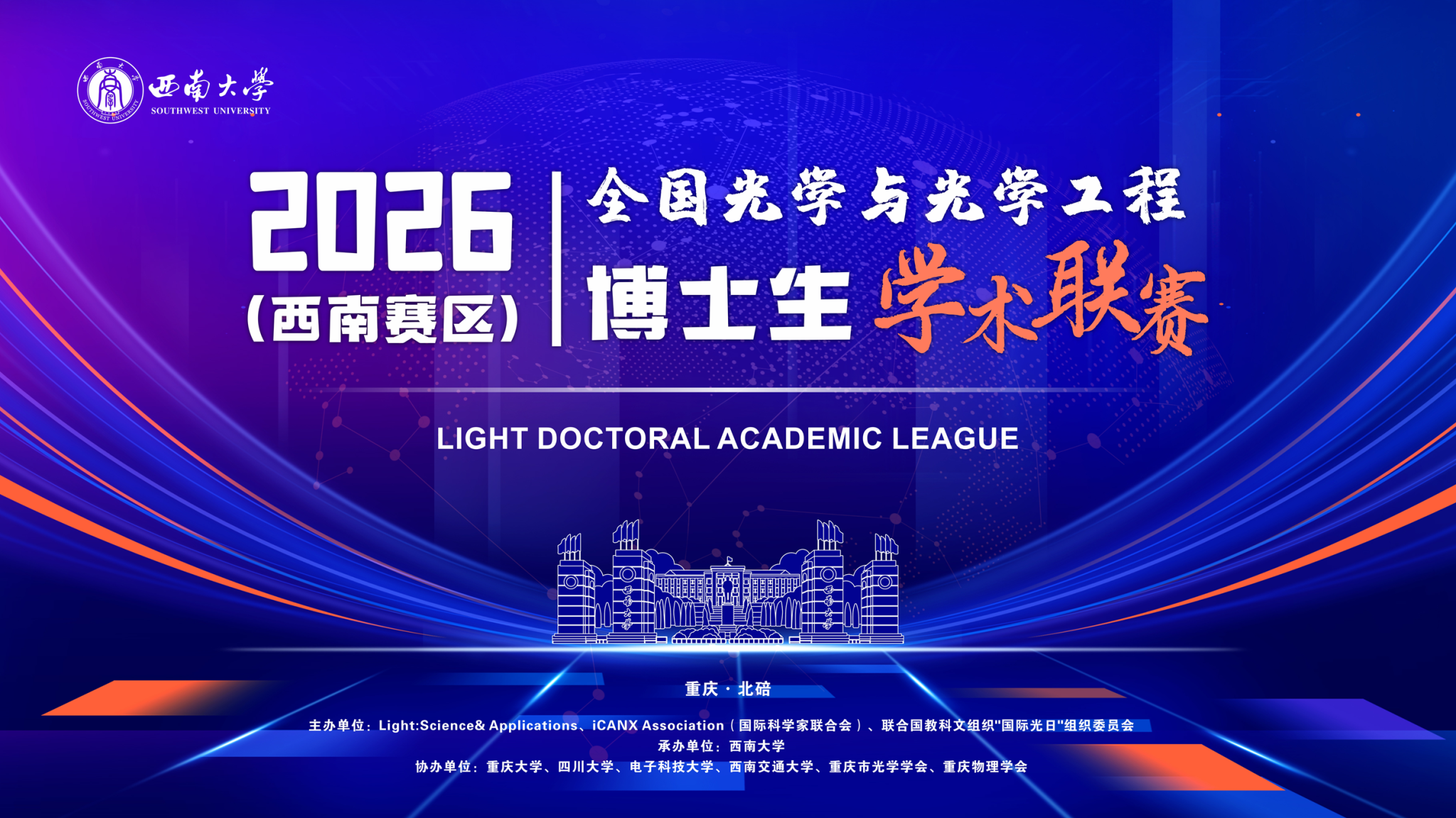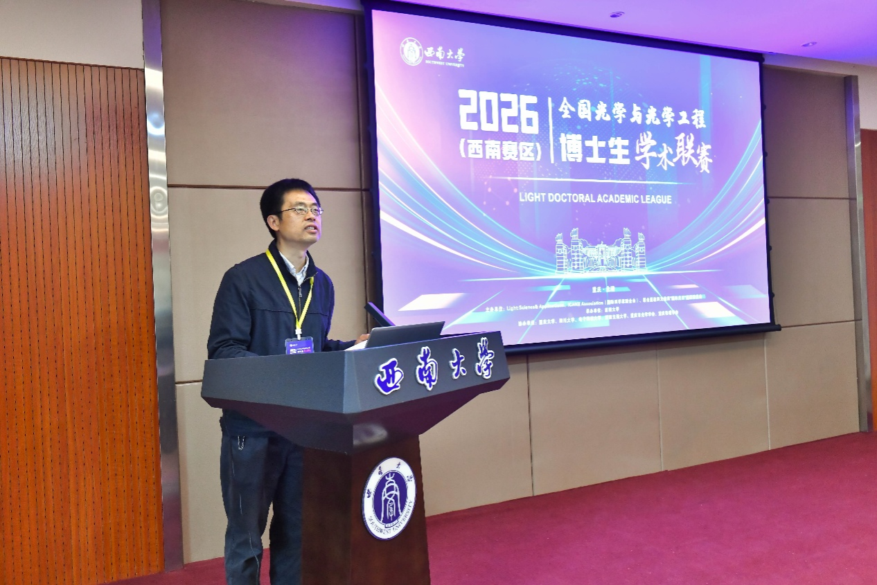 春潮涌动,万象更新。2026年4月12日,全国光学与光学工程2026博士生学术联赛(西南赛区)在西南大学隆重开幕并圆满落幕。本次赛事由Light: Science & Applications、iCANX Association和联合国教科文组织“国际光日”组织委员会联合主办,西南大学承办,重庆大学、四川大学、电子科技大学、西南交通大学、重庆市光学学会、重庆市物理学会等单位协办,汇聚西南地区14所高校与科研院所的近百名青年学子及专家评委,共赴光学领域学术盛宴,共促学科创新发展。