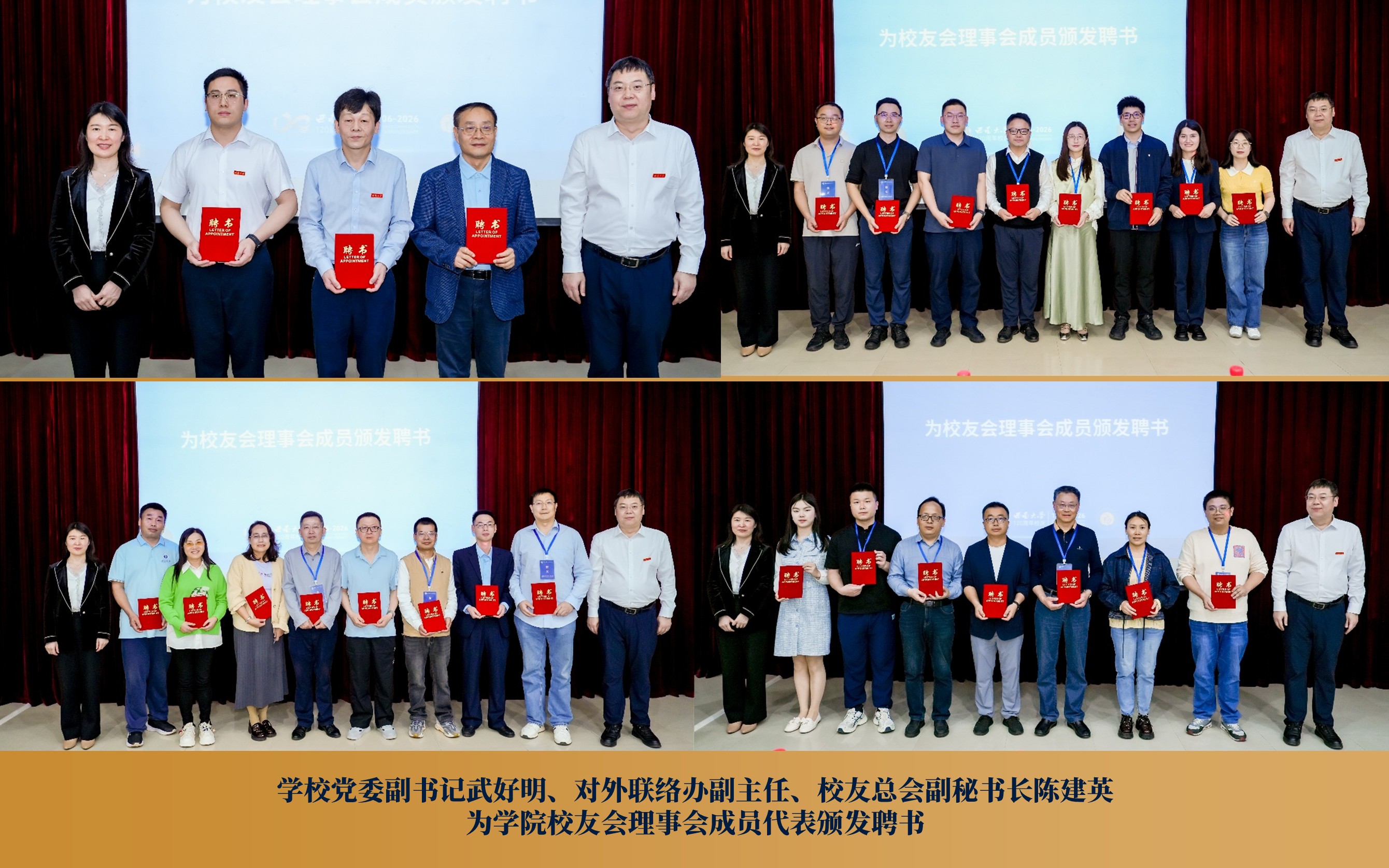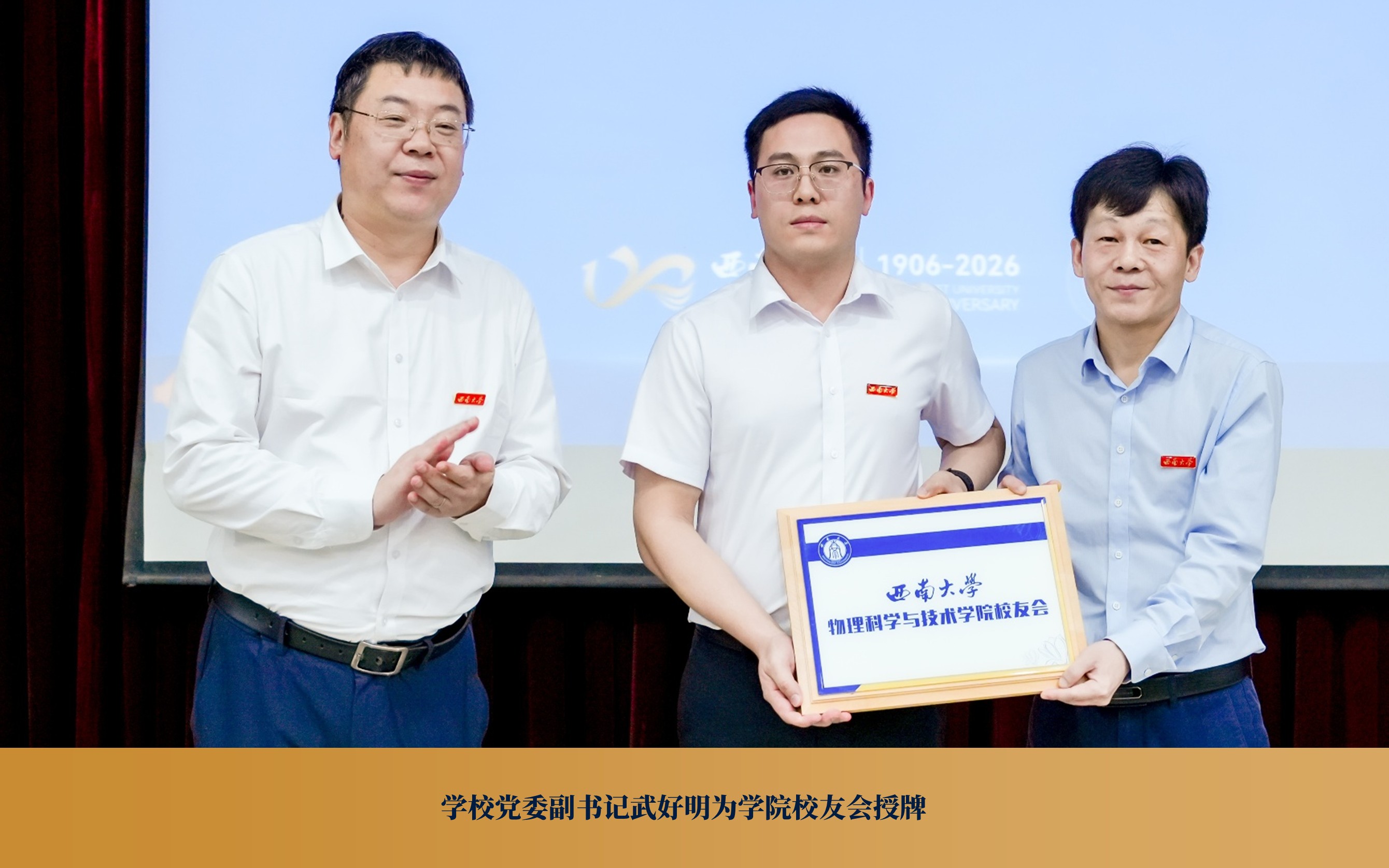 授牌与聘任仪式随后举行。学校党委副书记武好明为学院校友会授牌,标志着西南大学物理科学与技术学院校友会正式成立并步入规范化运行阶段。武好明、陈建英共同为首届理事会成员代表颁发聘书,全体与会人员以热烈的掌声,向受聘的理事会成员表示祝贺。