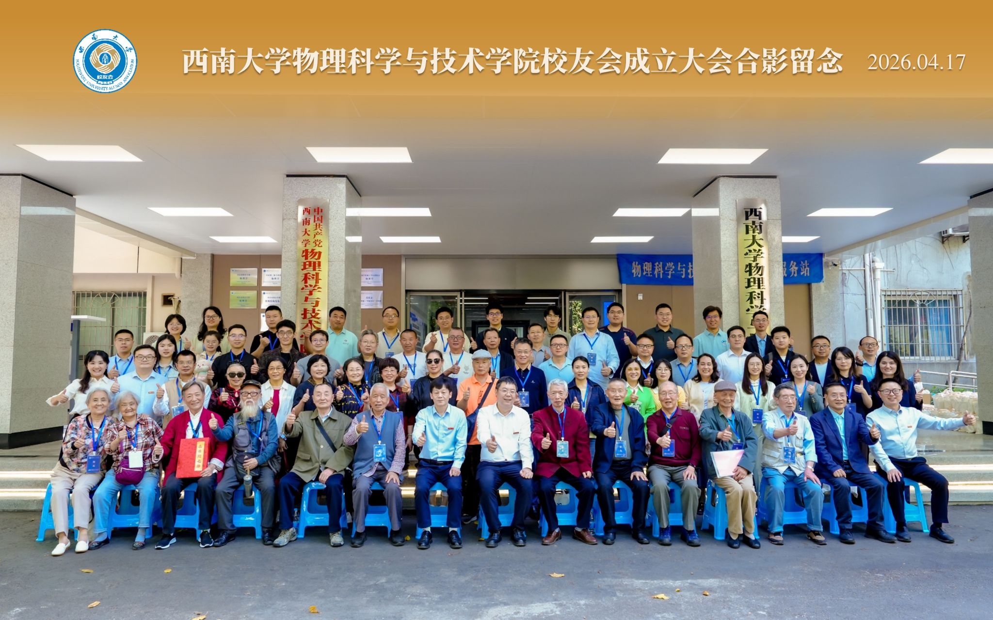 大会最后,全体参会人员在物理大楼前合影留念,定格这一具有里程碑意义的时刻。西南大学物理科学与技术学院校友会的成立,是凝聚校友力量、传承学院精神的关键举措,标志着学院校友工作正式进入组织化、规范化的发展阶段。未来,学院将以校友会为纽带,密切与全体校友的联系,汇聚校友智慧,整合校友资源,与全体校友同心同德、携手共进,持续夯实学科根基、提升办学水平,奋力书写学院高质量发展新篇章!