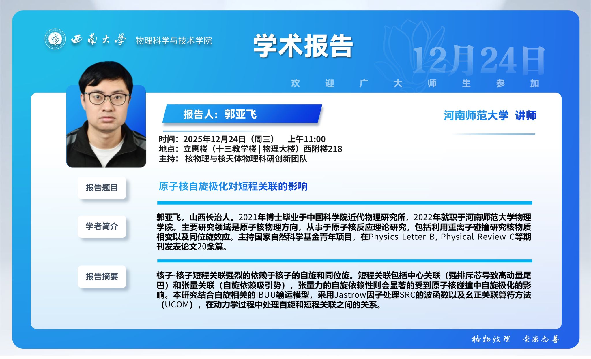 【学术报告】原子核自旋极化对短程关联的影响