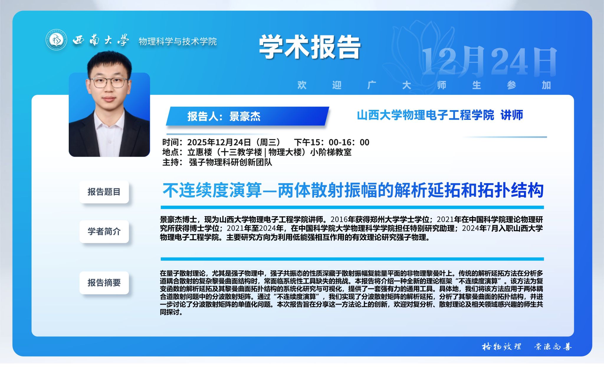 【学术报告】不连续度演算—两体散射振幅的解析延拓和拓扑结构