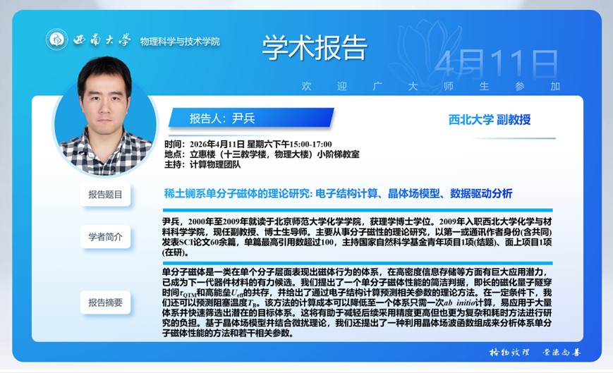 【学术报告】稀土镧系单分子磁体的理论研究:电子结构计算、晶体场模型、数据驱动分析